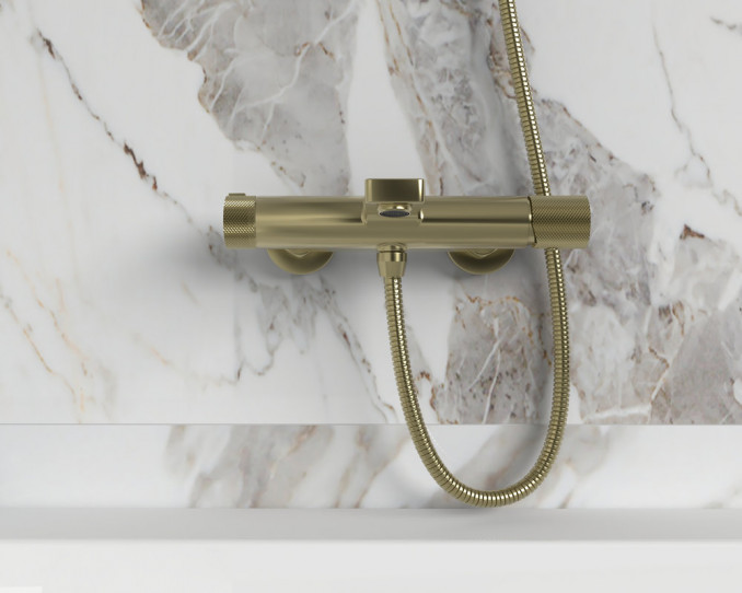Baterija za kadu COPEN NOOK u elegantnoj boji brušenog zlata, sa mešačem Ø35 i Neoperl perlatorom sa limitiranim protokom od 9 L/min, štedi vodu i smanjuje troškove.