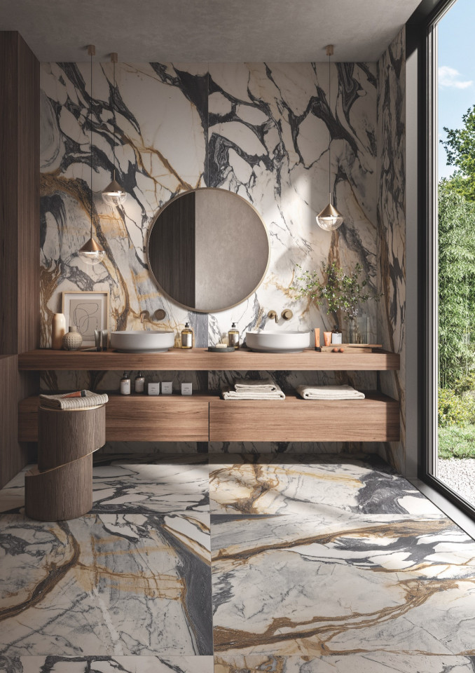 Imola The Room Calacatta Picasso Satin 120×278 cm je luksuzna porcelanska pločica velikog formata sa elegantnim mermernim dezenom u svetlim nijansama i satiniranom površinom.