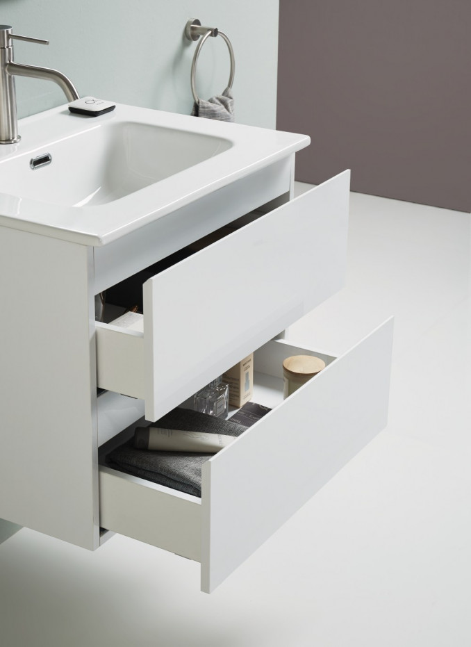 Opremljen je sa dve fioke sa soft-close mehanizmom, koji omogućava tiho i glatko zatvaranje, povećavajući komfor i dugotrajnost korišćenja. Ugrađeni lavabo savršeno se uklapa u celinu, čineći ovaj set praktičnim i estetski dopadljivim izborom.