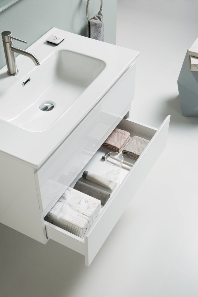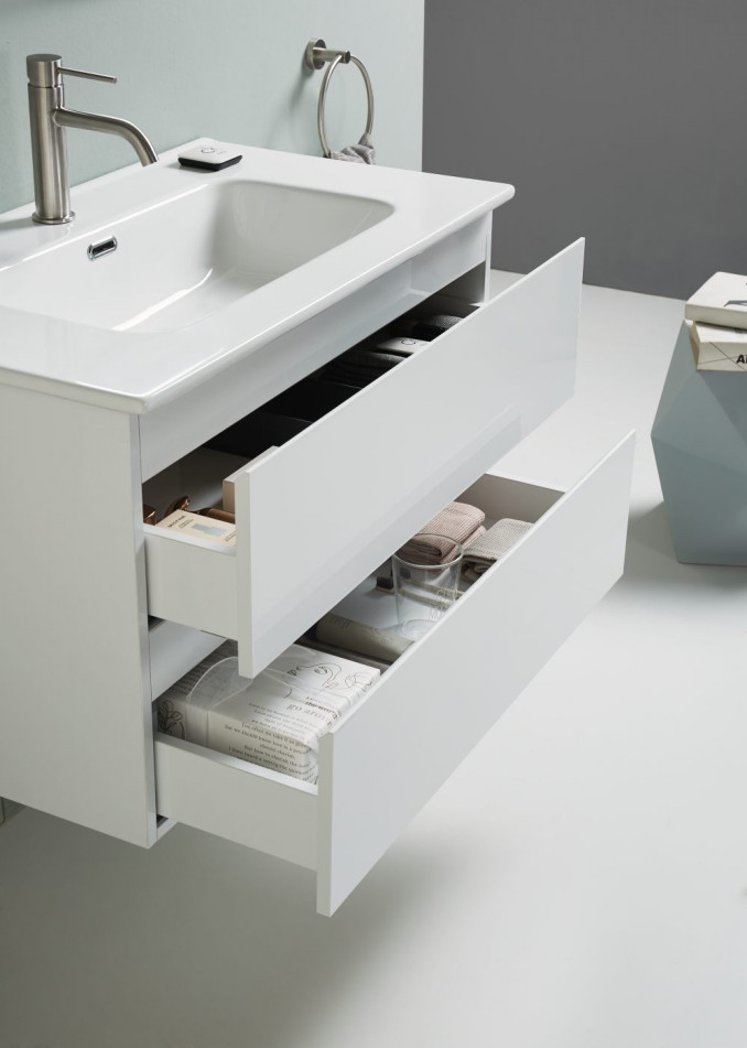 Ormarić je opremljen sa dve fioke sa soft-close mehanizmom, koje omogućavaju tiho i nežno zatvaranje, povećavajući udobnost i dug vek trajanja. Ugrađeni lavabo savršeno se uklapa u dizajn ormarića, čineći ovaj set funkcionalnim i estetski skladnim rešenjem.