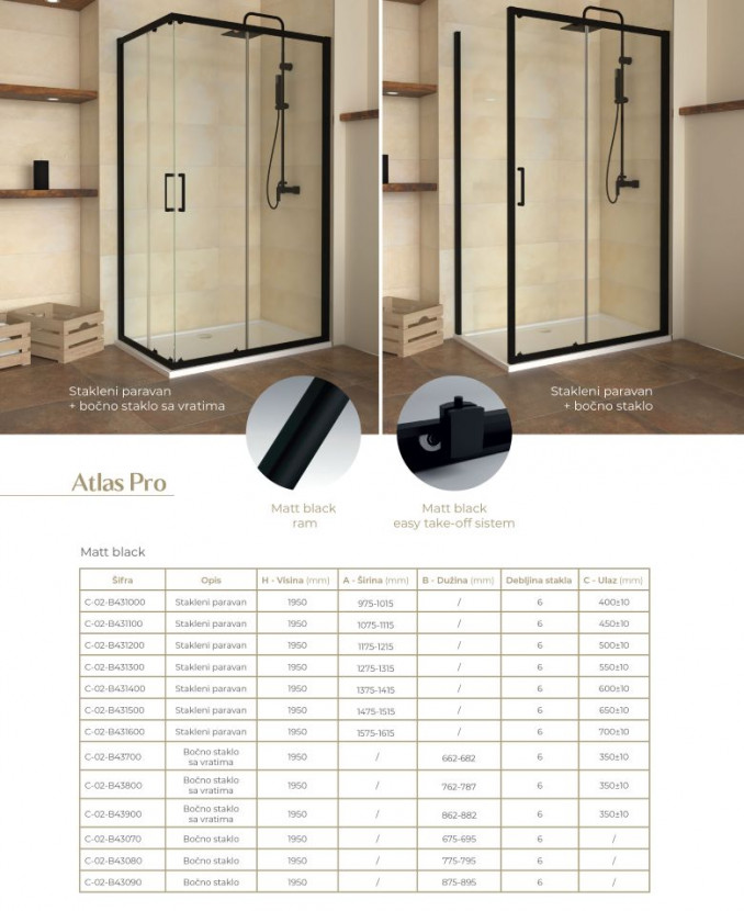 Tuš kabina ATLAS PRO mat crna, dimenzija 130x90 cm predstavlja idealno rešenje za moderno i funkcionalno kupatilo. Izrađena od kvalitetnog kaljenog stakla debljine 6 mm, ova kabina pruža dugotrajnost i sigurnost u svakodnevnoj upotrebi. Providno staklo doprinosi osećaju prostranosti i osvetljenosti, dok mat crni aluminijumski ram dodaje sofisticiran i elegantan izgled koji se lako uklapa u različite stilove enterijera.