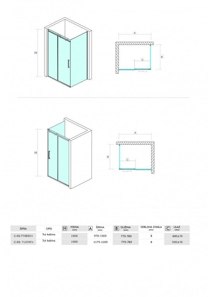 Tuš kabina COPEN NEPTUN 1200x800 staklo 8mm providno reverzibilna
