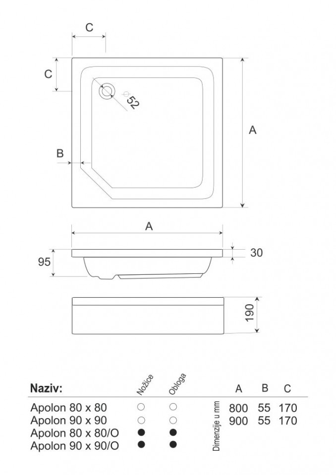 Tuš kadica COPEN LUNA 900x900 sa demontažnom maskom C-09-HAK9090