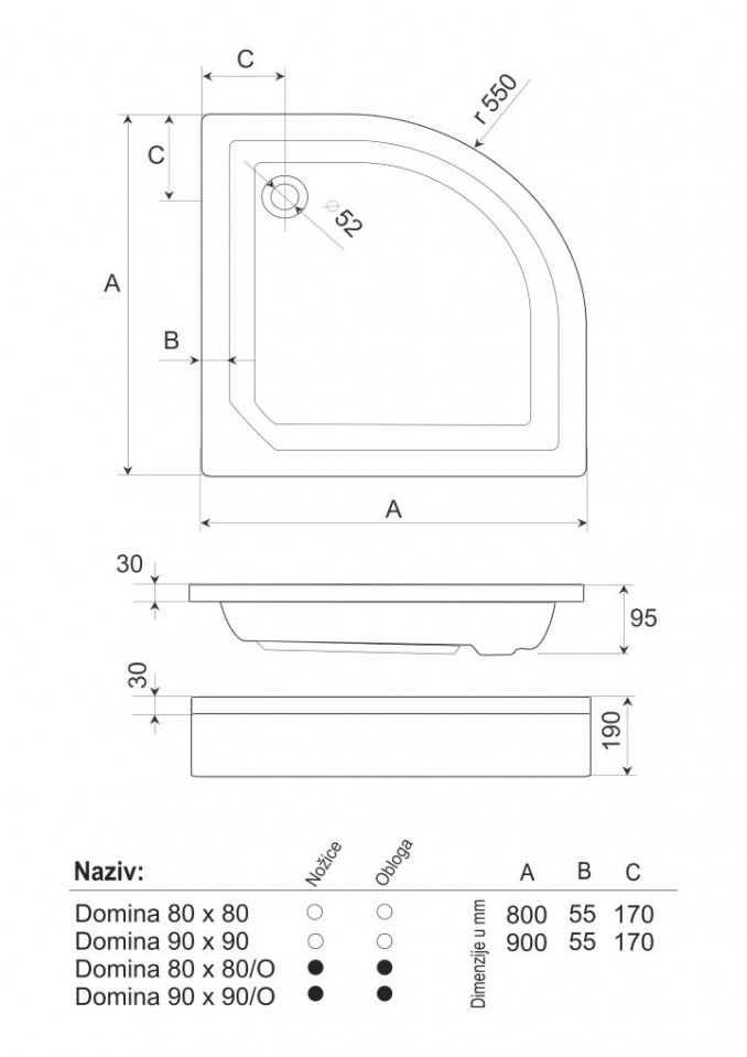 Polukružna tuš kada Luna od livenog sanitar-akrila, otporna i estetska, dimenzija R80.