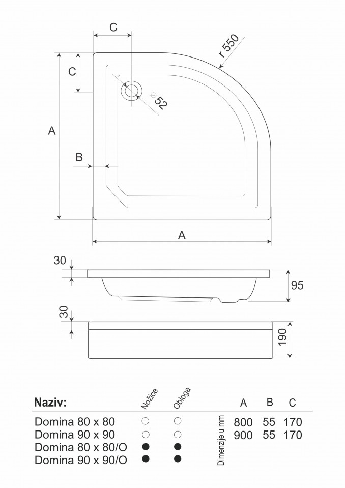 Polukružna tuš kada Luna od livenog sanitar-akrila, otporna i estetska, dimenzija R90.