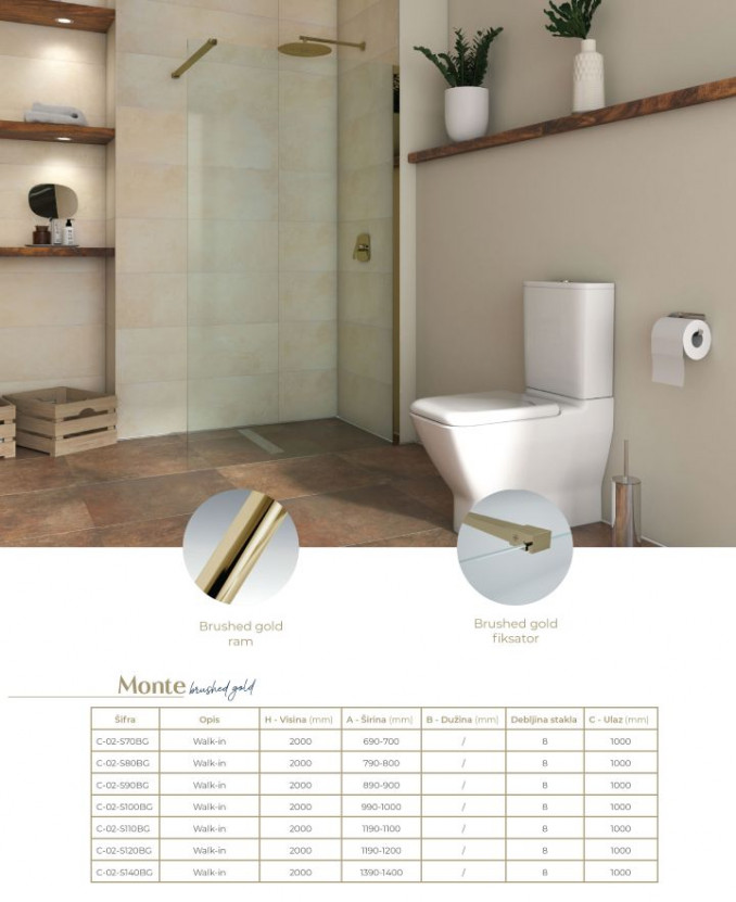 Walk-in tuš paravan COPEN MONTE 700x2000 mm sa 8 mm kaljenim staklom i ramom u boji brušenog zlata unosi eleganciju u svako kupatilo. Kvalitetna izrada i sjajna cena čine ga savršenim izborom za moderan enterijer.